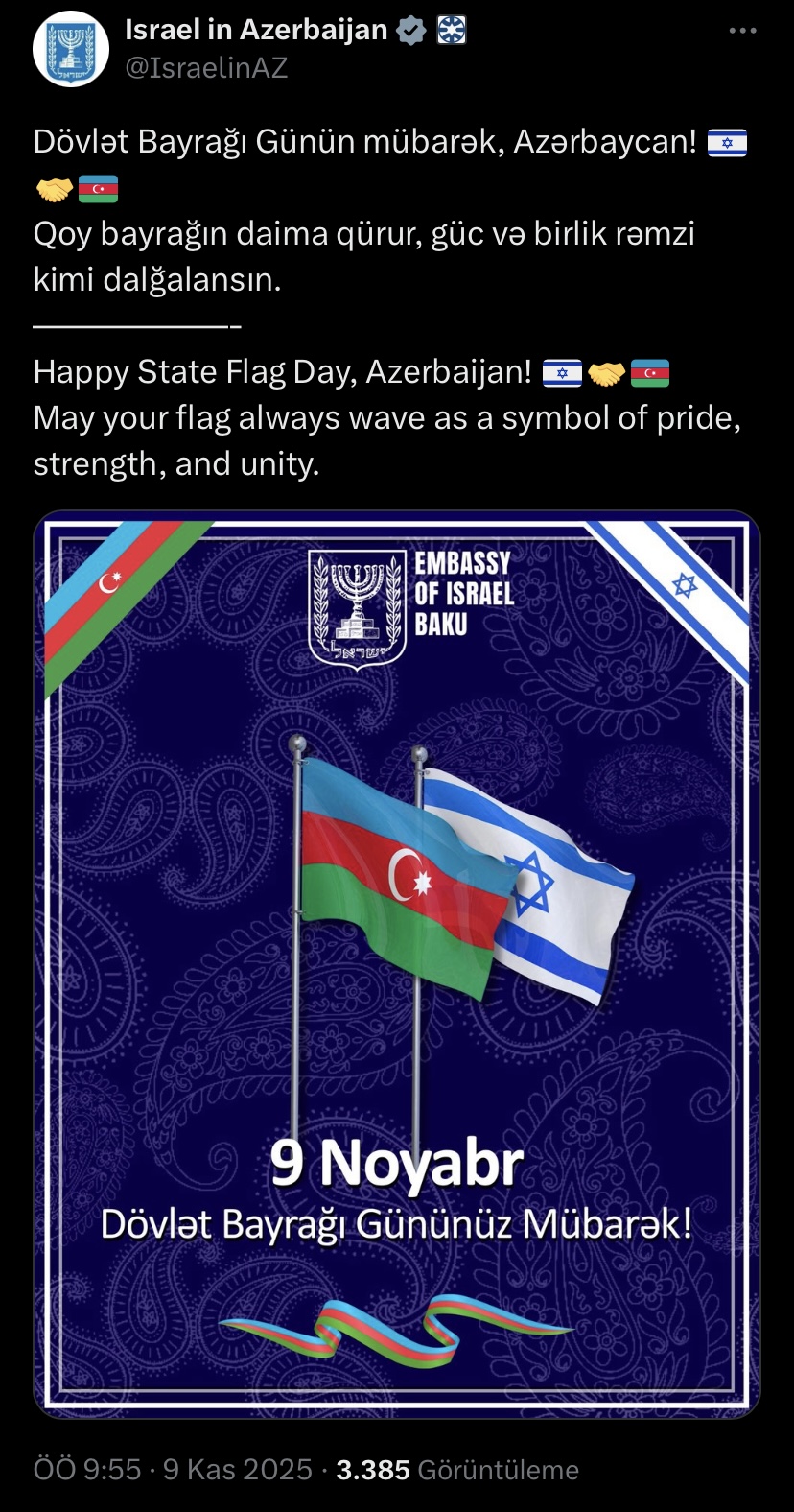Ana səhifə / Siyasət / İsrail səfirliyi: Qoy, bayrağın daima qürur, güc və birlik rəmzi kimi dalğalansın İsrail səfirliyi: Qoy, bayrağın daima qürur, güc və birlik rəmzi kimi dalğalansın 09.11.2025, 10:17 Operativ Media İsrailin Azərbaycandakı səfirliyi 9 Noyabr- Dövlət Bayrağı Günü münasibətilə Azərbaycanı təbrik edib. Operativ Media xəbər verir ki, bu barədə səfirliyin "X" hesabında paylaşım edilib. "Dövlət Bayrağı Günün mübarək, Azərbaycan! Qoy, bayrağın daima qürur, güc və birlik rəmzi kimi dalğalansın", - paylaşımda bildirilib.