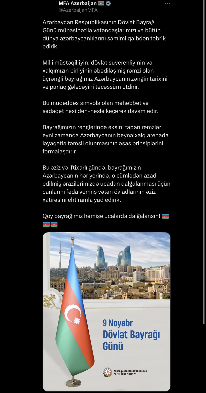 Azərbaycanın Xarici İşlər Nazirliyinin (XİN) rəsmi X səhifəsində 9 Noyabr - Dövlət Bayrağı Günü münasibətilə paylaşım edilib.
