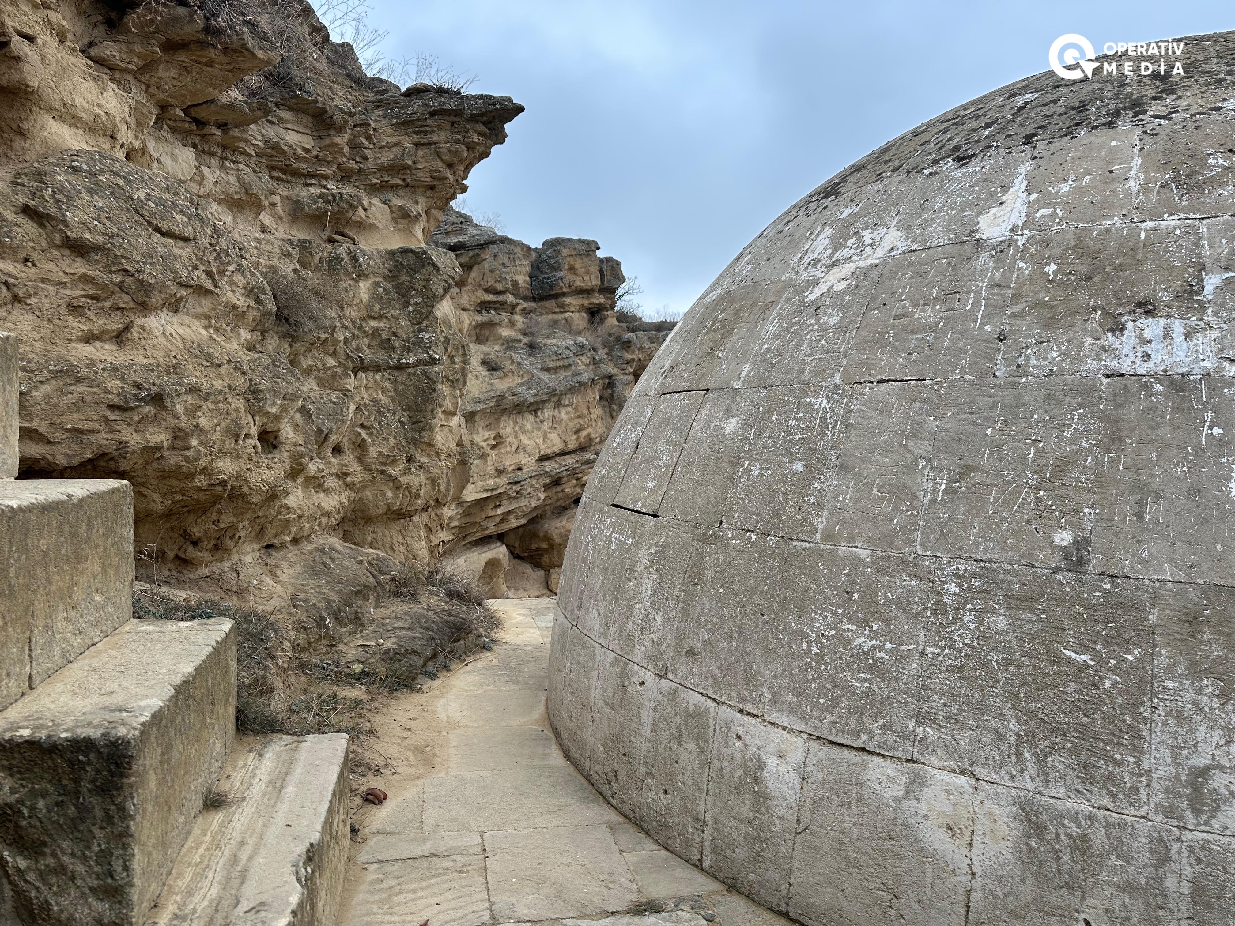 Səhərin ilk saatlarında türbənin qarşısında sakitlik hökm sürür. Qayanın içindən gələn sükut, ətrafa yayılan ilıq hava və uzaqlardan eşidilən quş səsləri bu məkanı fərqli bir mühit halına gətirir.