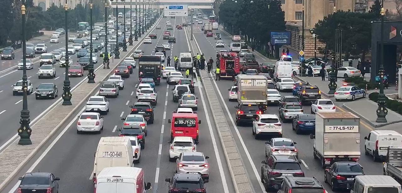 Nərimanov rayonu, Heydər Əliyev prospekti, əsas yolda avtomobillərin birində yanğın baş verib. Həm bu, həm də bəzi sürücülərin hadisə yerinə baxması səbəbindən prospektin hər iki istiqamətində nəqliyyat sıxlığı yaranıb.