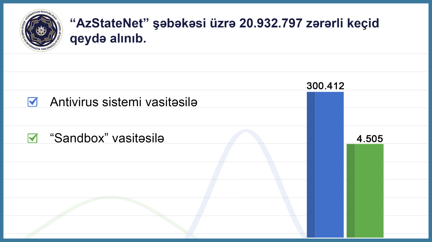 Bununla yanaşı son istifadəçilərdə quraşdırılan təhlükəsizlik həlləri (mərkəzləşdirilmiş antivirus sistemi) vasitəsilə 300 412 sayda zərərli fəaliyyətin qarşısı alınmışdır.