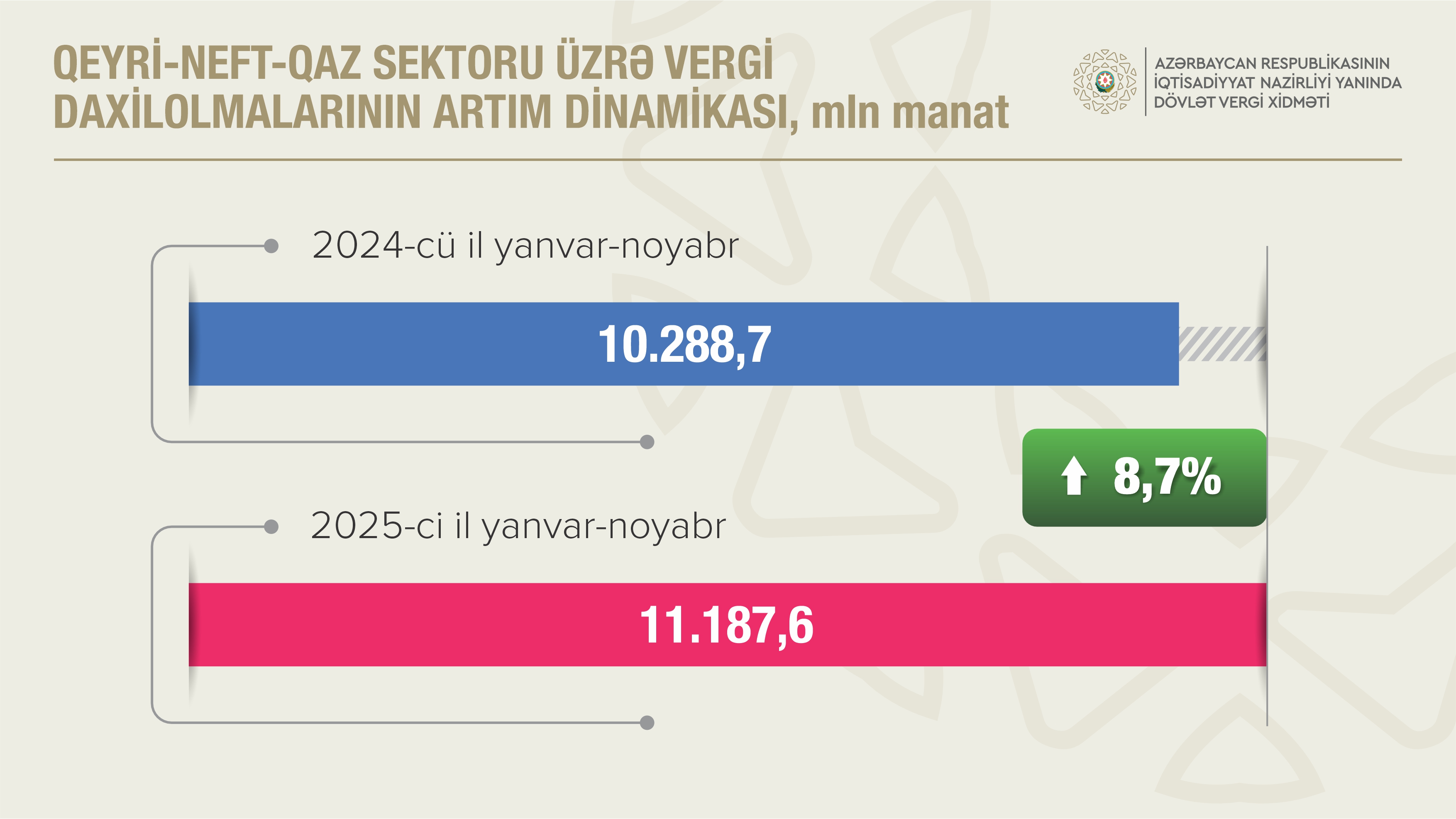 Bildirilib ki, qeyri-neft-qaz sektorundan daxilolmalar 11 milyard 187,6 milyon manat olub, proqnoz 102,7 faiz icra edilib. Əvvəlki ilin müvafiq dövrü ilə müqayisədə bu sektordan vergi daxilolmaları 899,0 milyon manat və ya 8,7 faiz artıb.