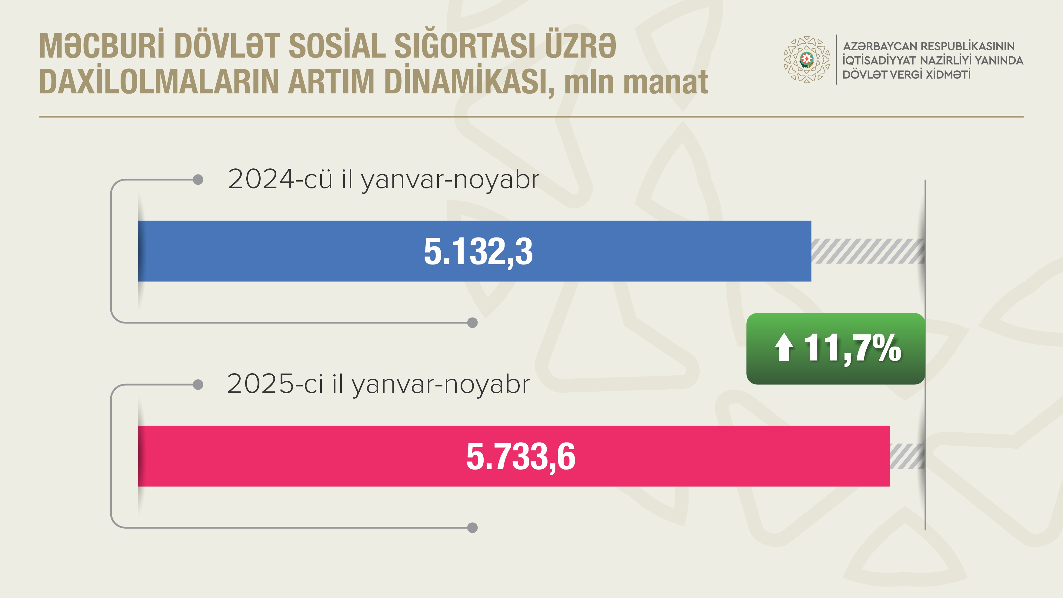 2025-ci ilin yanvar – noyabr aylarında muzdlu işçi sayının və əməkhaqqı fondunun “ağarması” prosesi şəraitində məcburi dövlət sosial sığorta haqları üzrə daxilolmalar 5 milyard 733,6 milyon manat təşkil edib. Bu mənbədən daxilolmalar əvvəlki ilin müvafiq dövrü ilə müqayisədə 11,7 faiz və ya 601,3 milyon manat artıb. Qeyri-büdcə təşkilatları üzrə daxilolmalar ötən ilin eyni dövrünə nisbətən 12,3 faiz artaraq 3 milyard 832,2 milyon manat olub.