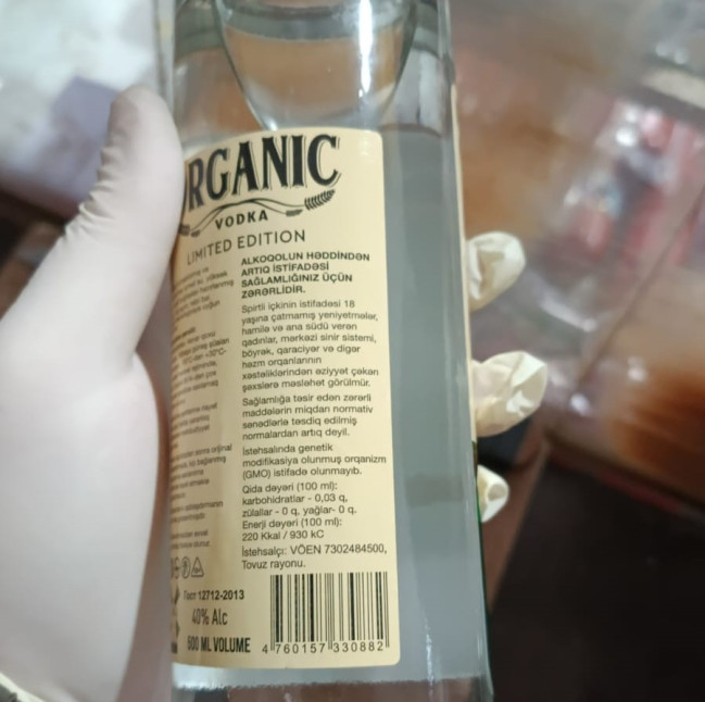 Belə ki, marketdə ümumi sayı 62 ədəd “Gold Organic”, “Organic Vodka”, “Lux Organic” əmtəə nişanlı mənşəyi məlum olmayan saxta alkoqollu içkilər müəyyən edilərək satışdan kənarlaşdırılıb. Məhsullardan nümunələr götürülərək laborator müayinələrə cəlb olunub.