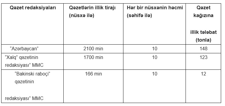 Dövlət sifarişlərinin yerinə yetirilməsi üçün “Azərbaycan” qəzeti redaksiyasına, “Xalq” qəzetinin redaksiyası” Məhdud Məsuliyyətli Cəmiyyətinə və “Bakinski raboçi” qəzetinin redaksiyası” Məhdud Məsuliyyətli Cəmiyyətinə dövlət büdcəsinin vəsaiti hesabına alınacaq qəzet kağızının norması müəyyənləşib.