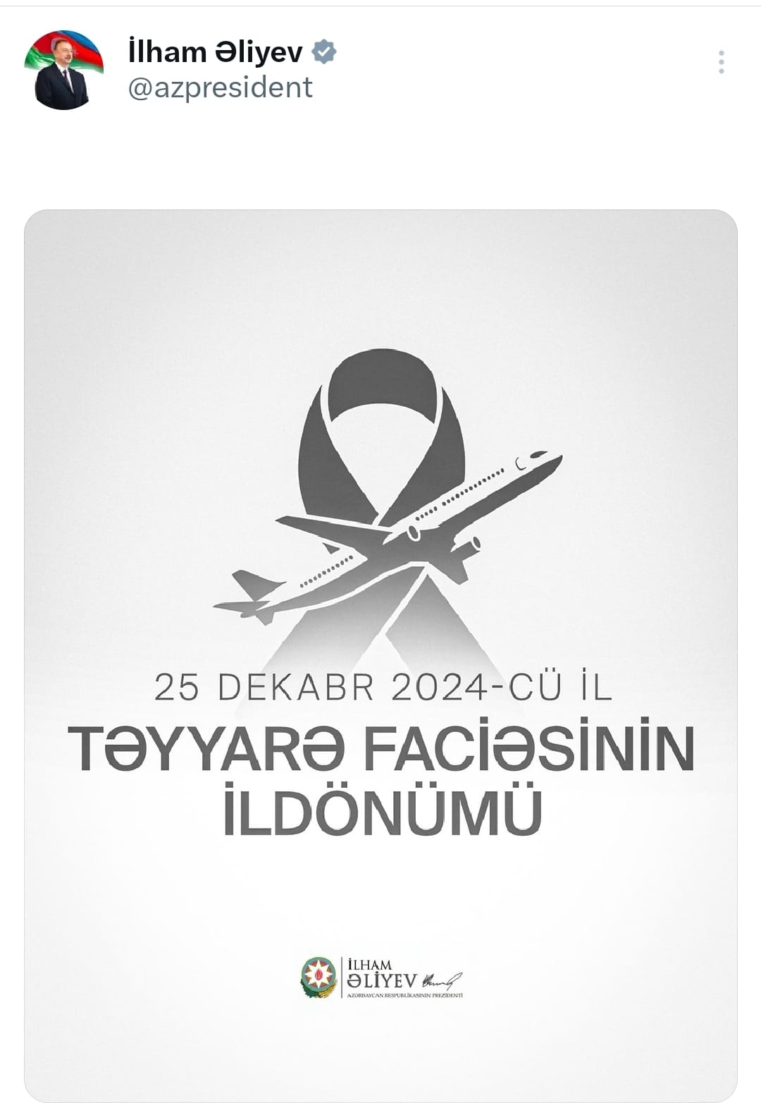 Azərbaycan Prezidenti İlham Əliyev "Azərbaycan Hava Yolları"na məxsus "Embraer 190" təyyarəsinin qəzaya uğramasının birinci ildönümü ilə bağlı sosial media hesablarında paylaşım edib.