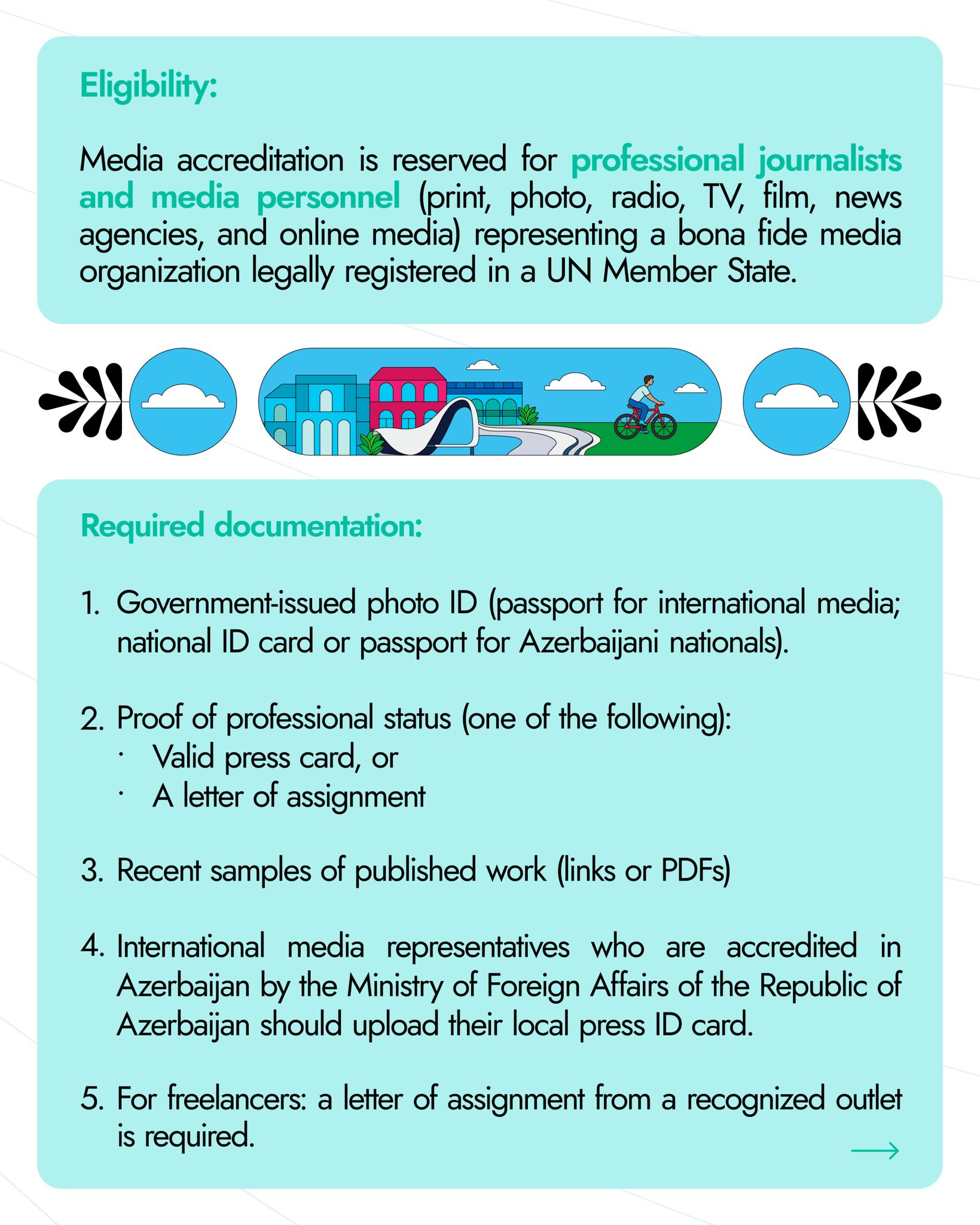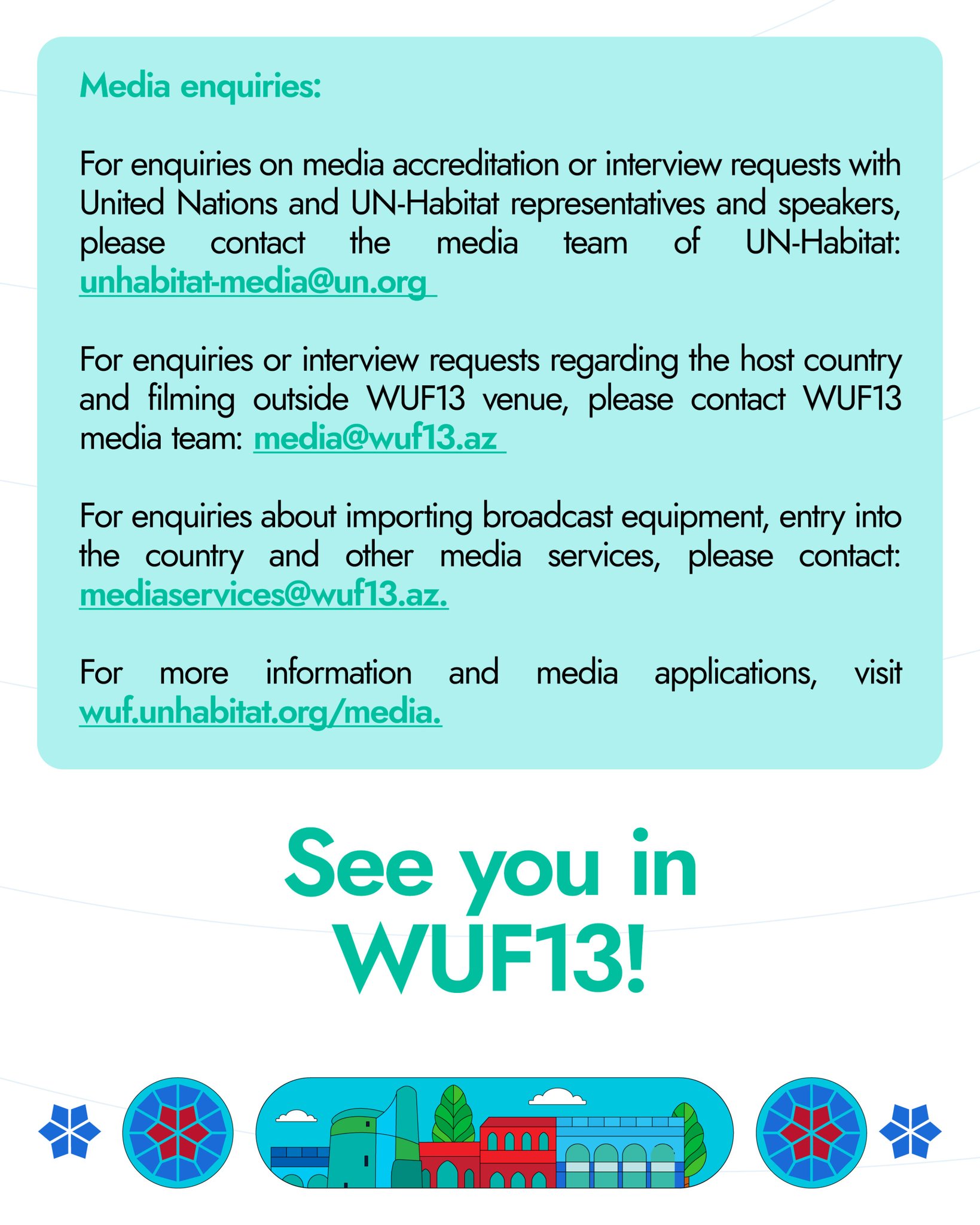 Operativ Media xəbər verir ki, media akkreditasiyası BMT-yə üzv ölkələrdə qanuni qeydiyyatdan keçmiş və etibarlı media qurumlarını təmsil edən peşəkar jurnalistlər üçün nəzərdə tutulur və yalnız UN-Habitat-ın rəsmi onlayn sistemi - events.unhabitat.org - vasitəsilə həyata keçirilir. Elektron və ya adi poçtla göndərilən müraciətlər qəbul edilmir.