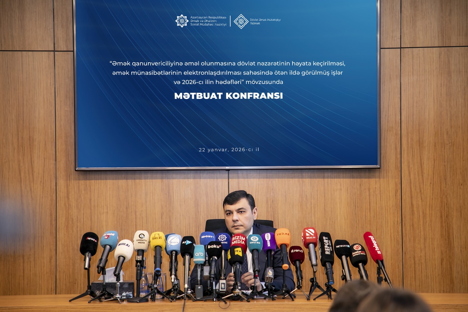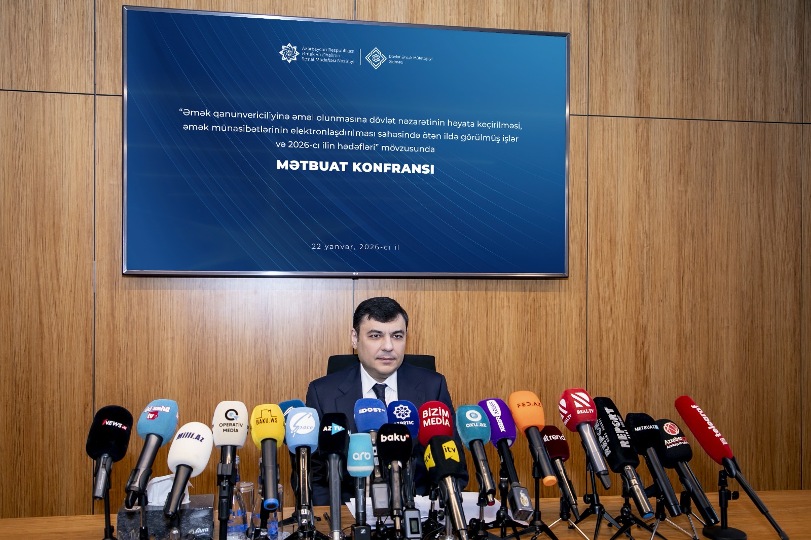 Operativ Media xəbər verir ki, Əmək və Əhalinin Sosial Müdafiəsi Nazirliyi yanında Dövlət Əmək Müfəttişliyi Xidməti (DƏMX) tərəfindən “Əmək qanunvericiliyinə əməl olunmasına dövlət nəzarətinin həyata keçirilməsi, əmək münasibətlərinin elektronlaşdırılması sahəsində ötən ildə görülmüş işlər və 2026-cı ilin hədəfləri” mövzusunda mətbuat konfransı keçirilib.
