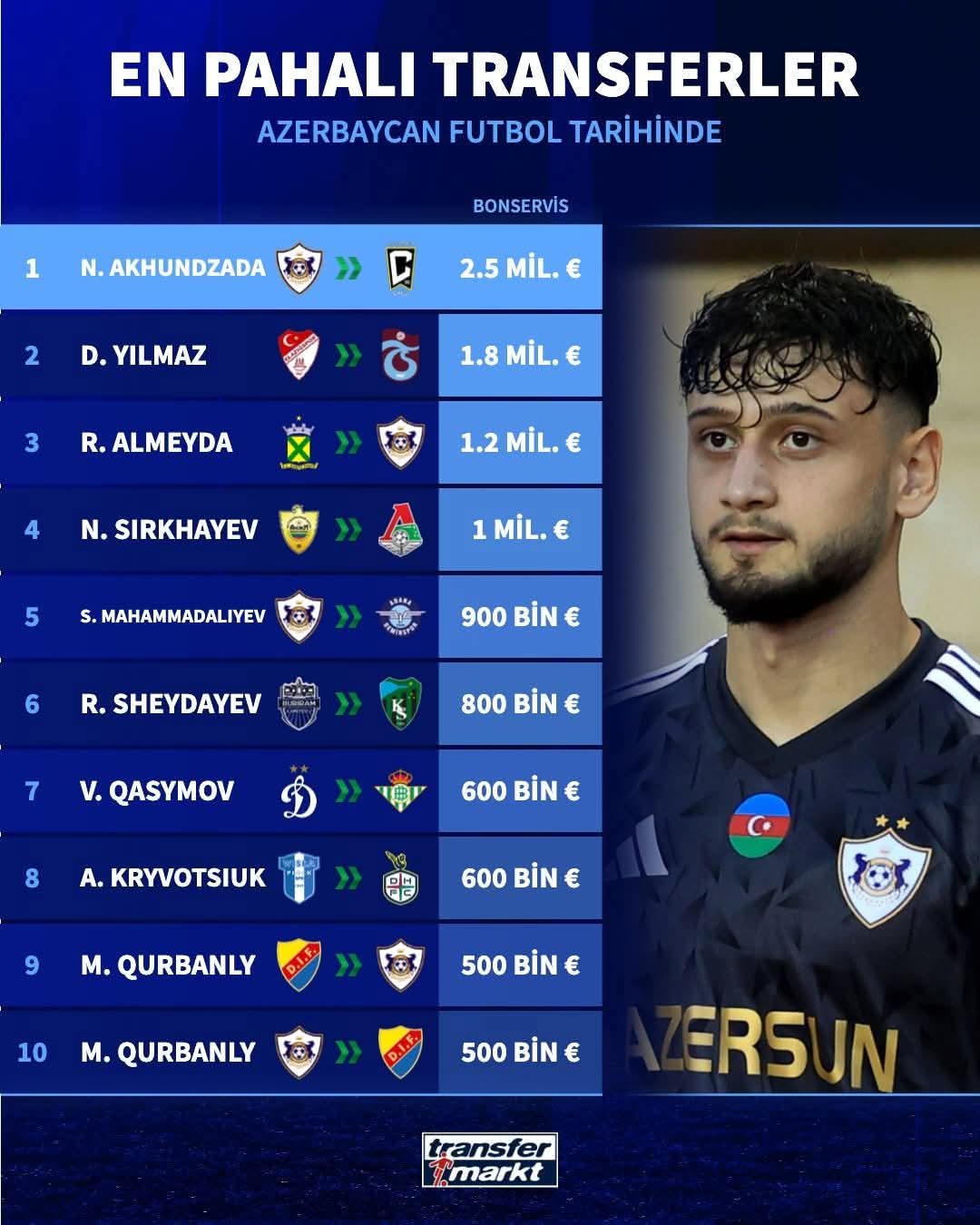 Operativ Media “Transfermarkt” portalına istinadən xəbər verir ki, siyahıya 2,5 milyon avro ilə Nəriman Axundzadənin transferi başçılıq edir. İkinci pillədə 1,8 milyon avro ilə Deniz Yılmaz qərarlaşıb. İlk üçlüyü isə 1,2 milyon avro məbləğində transferlə Riçard Almeyda tamamlayır.