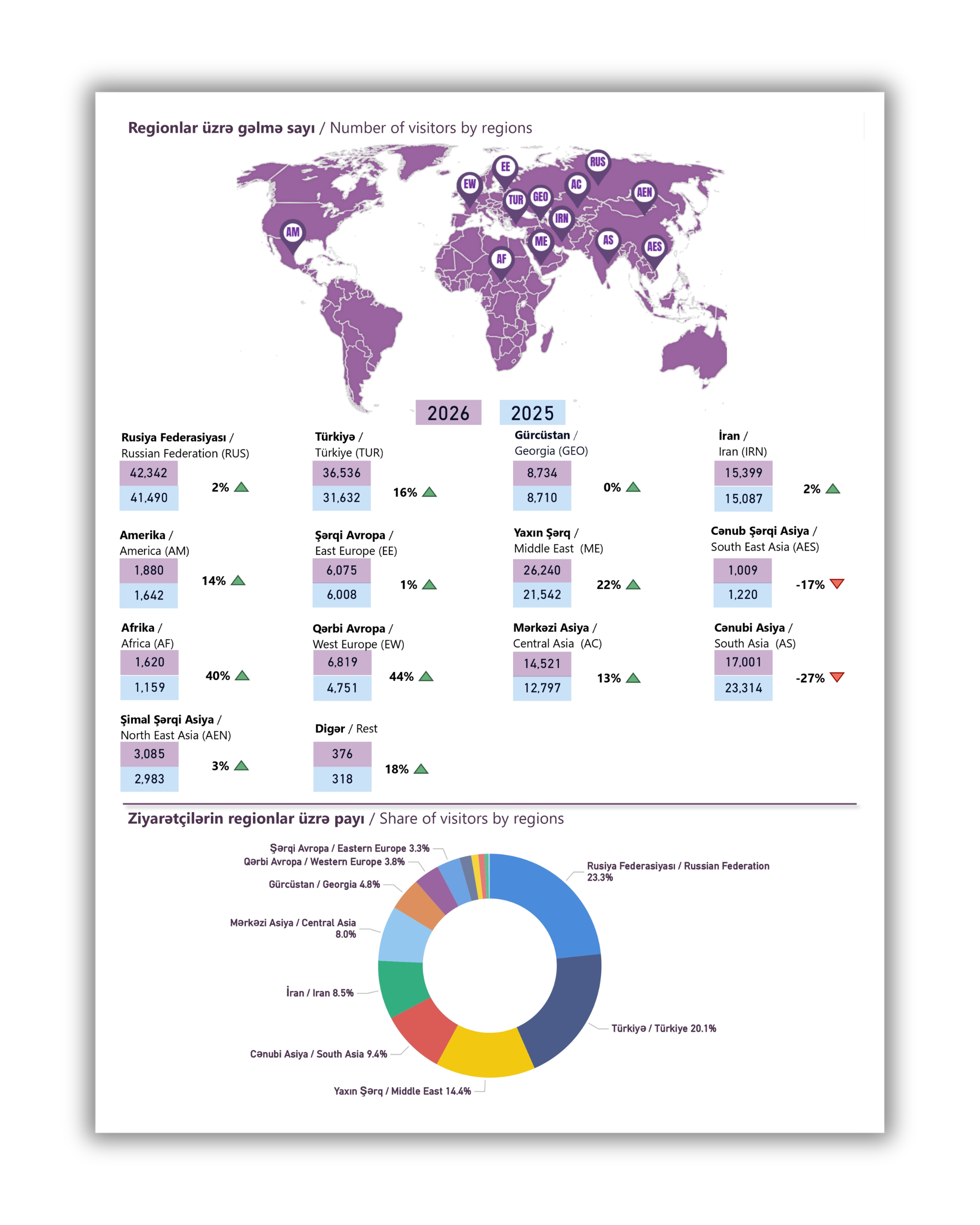 Regionlar üzrə dinamika göstərir ki, Yaxın Şərq ölkələrindən gələnlərin sayı 22 % artaraq 26 240 nəfərə, Qərbi Avropa ölkələrindən gələnlərin sayı isə 44 % artaraq 6 819 nəfərə çatıb.