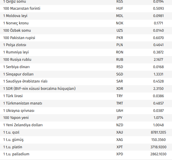 Ana səhifə / İqtisadiyyat / AMB-nin bu günə olan valyuta məzənnələri AMB-nin bu günə olan valyuta məzənnələri 10.03.2026, 09:13 Xəbərlər redaksiyası Azərbaycan Mərkəzi Bankının bu günə olan rəsmi valyuta məzənnələrinə əsasən, ABŞ dollarının məzənnəsi dəyişməyərək 1,7000 manat olub. Operativ Media xəbər verir ki, avronun məzənnəsi 0,005 % azalaraq 1,9740 manat, 100 Rusiya rublunun məzənnəsi 0,2 % artaraq 2,1677 manat təşkil edib.