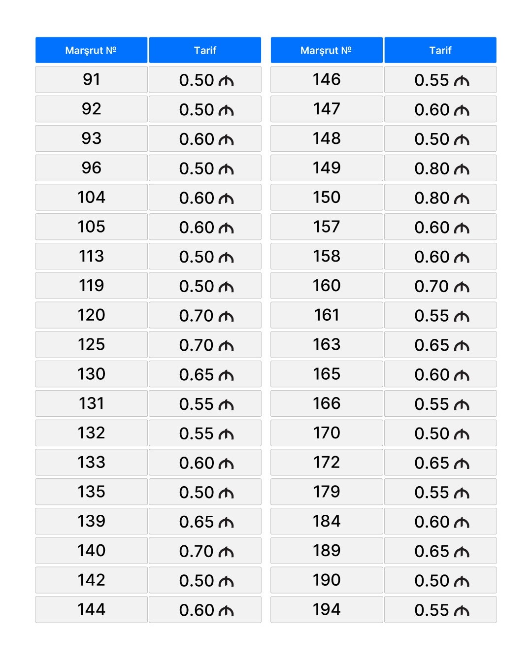Ana səhifə / Slayder / Bakıda marşrut avtobuslarında gedişhaqqı MƏBLƏĞLƏRİ Bakıda marşrut avtobuslarında gedişhaqqı MƏBLƏĞLƏRİ 13.03.2026, 16:52 Operativ Media Bakı və paytaxtətrafı marşrut avtobuslarında nağdsız gedişhaqqı tarifləri yenilənib.Operativ Media xəbər verir ki, bu barədə AYNA məlumat yayıb.Belə ki, yenilənmiş marşrut avtobuslarında gedişhaqqı standart tariflərə uyğunlaşdırılıb.Buna əsasən, marşrut avtobuslarında nağdsız gedişhaqqı tarifləri aşağıdakı kimi müəyyən edilib: