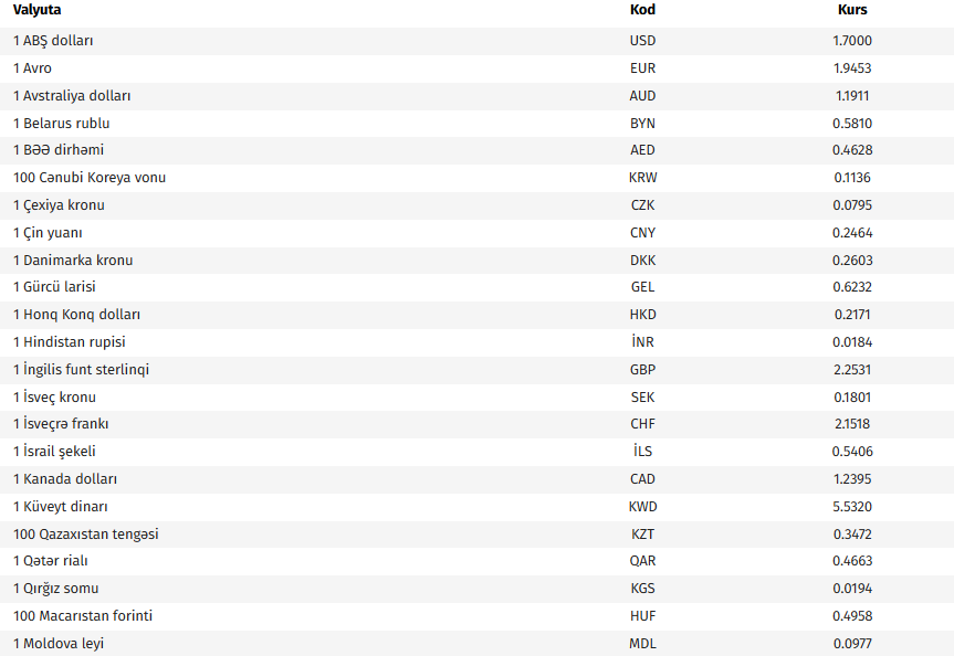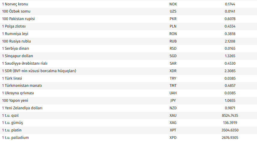 Ana səhifə / İqtisadiyyat / AMB-nin bu günə olan valyuta məzənnələri AMB-nin bu günə olan valyuta məzənnələri 16.03.2026, 09:08 Operativ Media Azərbaycan Mərkəzi Bankının bu günə olan rəsmi valyuta məzənnələrinə əsasən, ABŞ dollarının məzənnəsi dəyişməyərək 1,7000 manat olub. Operativ Media xəbər verir ki, avronun məzənnəsi 0,5 % azalaraq 1,9453 manat, 100 Rusiya rublunun məzənnəsi 0,7 % azalaraq 2,1208 manat təşkil edib.