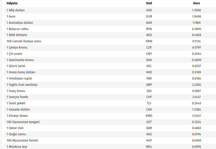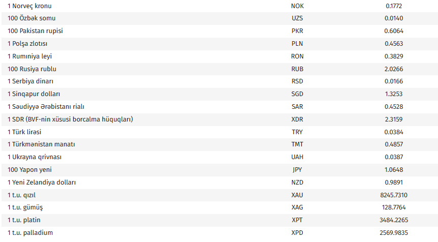 Ana səhifə / İqtisadiyyat / AMB-nin bu günə olan valyuta məzənnələri AMB-nin bu günə olan valyuta məzənnələri 19.03.2026, 09:11 Operativ Media Azərbaycan Mərkəzi Bankının bu günə olan rəsmi valyuta məzənnələrinə əsasən, ABŞ dollarının məzənnəsi dəyişməyərək 1,7000 manat olub. Operativ Media xəbər verir ki, avronun məzənnəsi 0,6 % azalaraq 1,9498 manat, 100 Rusiya rublunun məzənnəsi 1,7 % azalaraq 2,0266 manat təşkil edib.