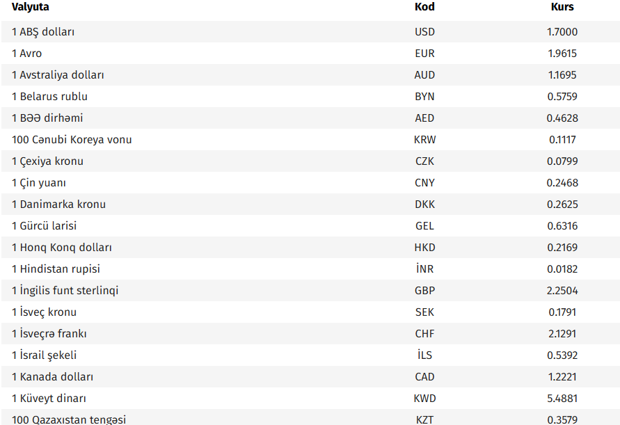 Ana səhifə / İqtisadiyyat / AMB-nin bu günə olan valyuta məzənnələri AMB-nin bu günə olan valyuta məzənnələri 02.04.2026, 09:13 Operativ Media Azərbaycan Mərkəzi Bankının bu günə olan rəsmi valyuta məzənnələrinə əsasən, ABŞ dollarının məzənnəsi dəyişməyərək 1,7000 manat olub. Operativ Media xəbər verir ki, avronun məzənnəsi 0,2 % azalaraq 1,9615 manat, 100 Rusiya rublunun məzənnəsi 0,9 % artaraq 2,1087 manat təşkil edib.