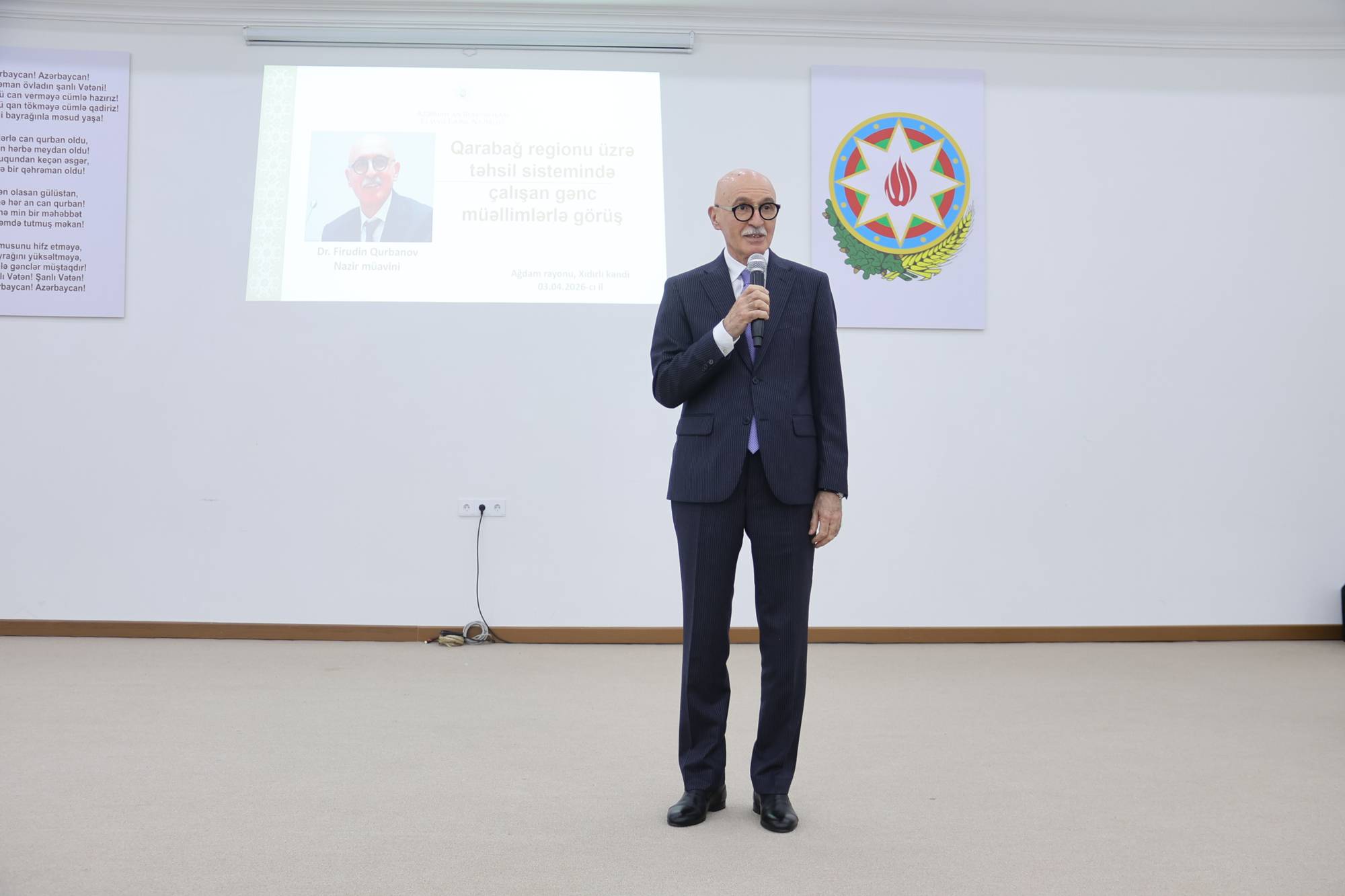 Ağdam rayonuna səfərin davamında Qarabağ Regional Təhsil İdarəsinin tabeliyində fəaliyyət göstərən ümumi təhsil müəssisələrində çalışan gənc müəllimlərlə görüş keçirilib. Görüşdə sözügedən region üzrə çalışan məktəb direktorları da iştirak ediblər. Görüş zamanı təhsilin keyfiyyətinin yüksəldilməsi, müəllimlərin peşəkar inkişafının dəstəklənməsi, müasir tədris metodlarının tətbiqi və innovativ yanaşmaların genişləndirilməsi məsələləri müzakirə olunub.