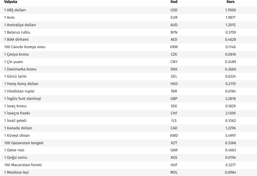 Ana səhifə / İqtisadiyyat / AMB-nin bu günə olan valyuta məzənnələri AMB-nin bu günə olan valyuta məzənnələri 10.04.2026, 09:20 Operativ Media Azərbaycan Mərkəzi Bankının bu günə olan rəsmi valyuta məzənnələrinə əsasən, ABŞ dollarının məzənnəsi dəyişməyərək 1,7000 manat olub. Operativ Media xəbər verir ki, avronun məzənnəsi 0,2 % artaraq 1,9877 manat, 100 Rusiya rublunun məzənnəsi 1 % artaraq 2,1931 manat təşkil edib.