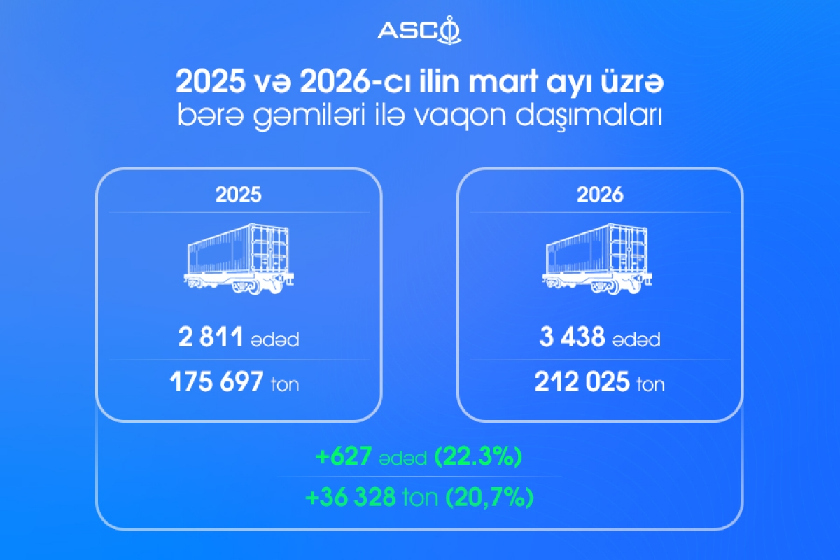 Belə ki, 2025-ci ilin mart ayında bərə gəmiləri ilə 2 811 ədəd vaqon daşındığı halda, 2026-cı ilin eyni ayında bu göstərici 3 438 ədədə yüksəlib. Artım 627 ədəd və ya 22,3 faiz təşkil edib.
