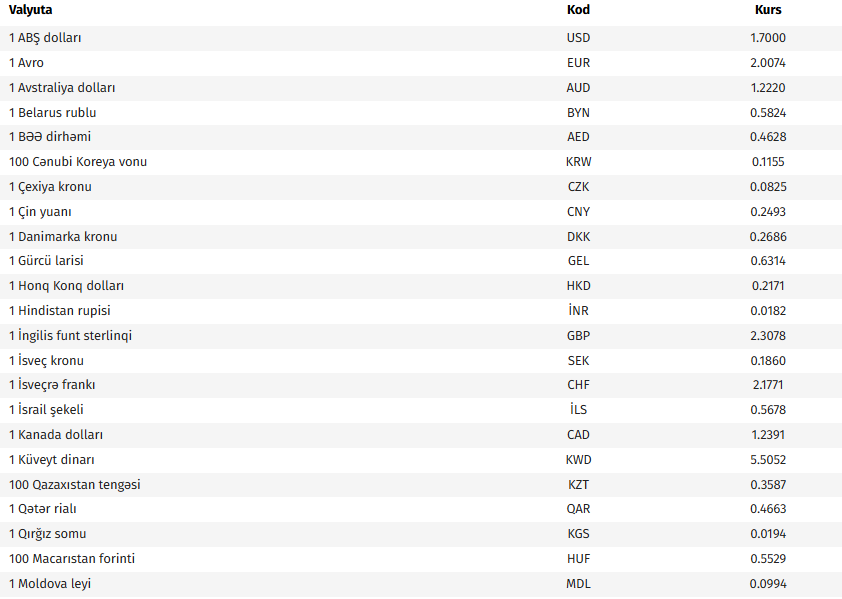 Ana səhifə / İqtisadiyyat / AMB-nin bu günə olan valyuta məzənnələri AMB-nin bu günə olan valyuta məzənnələri 16.04.2026, 09:10 Operativ Media Azərbaycan Mərkəzi Bankının bu günə olan rəsmi valyuta məzənnələrinə əsasən, ABŞ dollarının məzənnəsi dəyişməyərək 1,7000 manat olub. Operativ Media xəbər verir ki, avronun məzənnəsi 0,2 % artaraq 2,0074 manat, 100 Rusiya rublunun məzənnəsi 0,2 % azalaraq 2,2372 manat təşkil edib.