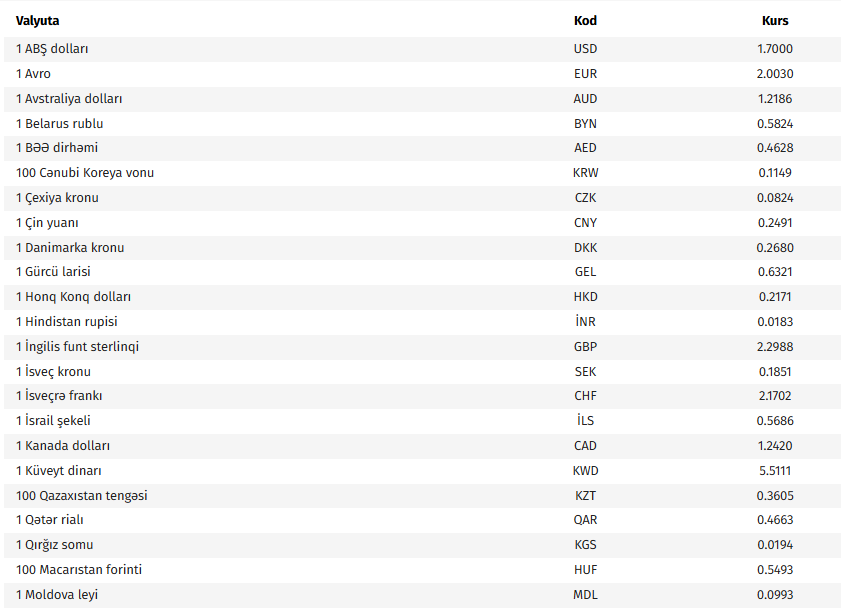 Ana səhifə / İqtisadiyyat / AMB-nin bu günə olan valyuta məzənnələri AMB-nin bu günə olan valyuta məzənnələri 17.04.2026, 09:15 Operativ Media Azərbaycan Mərkəzi Bankının bu günə olan rəsmi valyuta məzənnələrinə əsasən, ABŞ dollarının məzənnəsi dəyişməyərək 1,7000 manat olub. Operativ Media xəbər verir ki, avronun məzənnəsi 0,22 % azalaraq 2,0030 manat, 100 Rusiya rublunun məzənnəsi 0,51 % azalaraq 2,2257 manat təşkil edib.