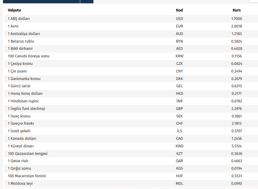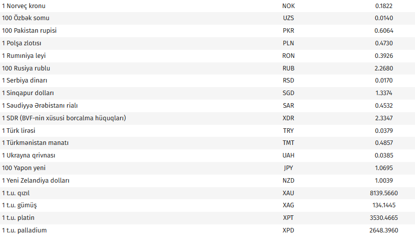 Ana səhifə / İqtisadiyyat / AMB-nin bu günə olan valyuta məzənnələri AMB-nin bu günə olan valyuta məzənnələri 21.04.2026, 09:11 Operativ Media Azərbaycan Mərkəzi Bankının bu günə olan rəsmi valyuta məzənnələrinə əsasən, ABŞ dollarının məzənnəsi dəyişməyərək 1,7000 manat olub. Operativ Media xəbər verir ki, avronun məzənnəsi 0,1 % artaraq 2,0018 manat, 100 Rusiya rublunun məzənnəsi isə 1,3 % artaraq 2,2680 manat təşkil edib.