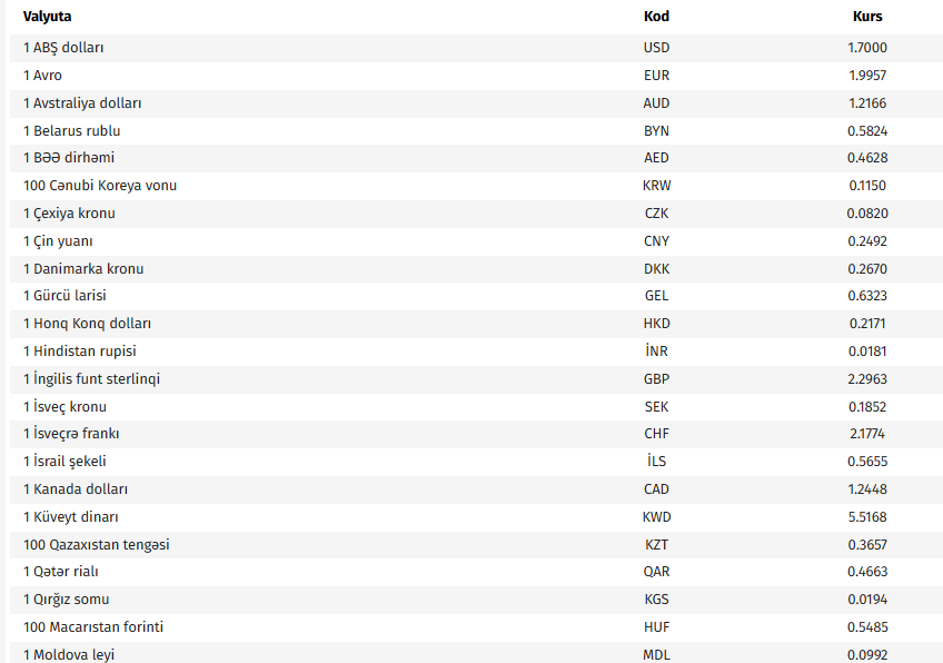 Azərbaycan Mərkəzi Bankının bu günə olan rəsmi valyuta məzənnələrinə əsasən, ABŞ dollarının məzənnəsi dəyişməyərək 1,7000 manat olub.