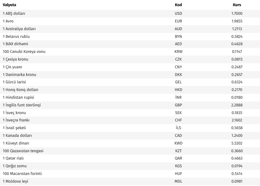 Ana səhifə / İqtisadiyyat / AMB-nin bu günə olan valyuta məzənnələri AMB-nin bu günə olan valyuta məzənnələri 24.04.2026, 09:13 Operativ Media Azərbaycan Mərkəzi Bankının bu günə olan rəsmi valyuta məzənnələrinə əsasən, ABŞ dollarının məzənnəsi dəyişməyərək 1,7000 manat olub. Operativ Media xəbər verir ki, avronun 0,2 % azalaraq 1,9855 manat, 100 Rusiya rublunun məzənnəsi 0,9 % azalaraq 2,2439 manat təşkil edib.