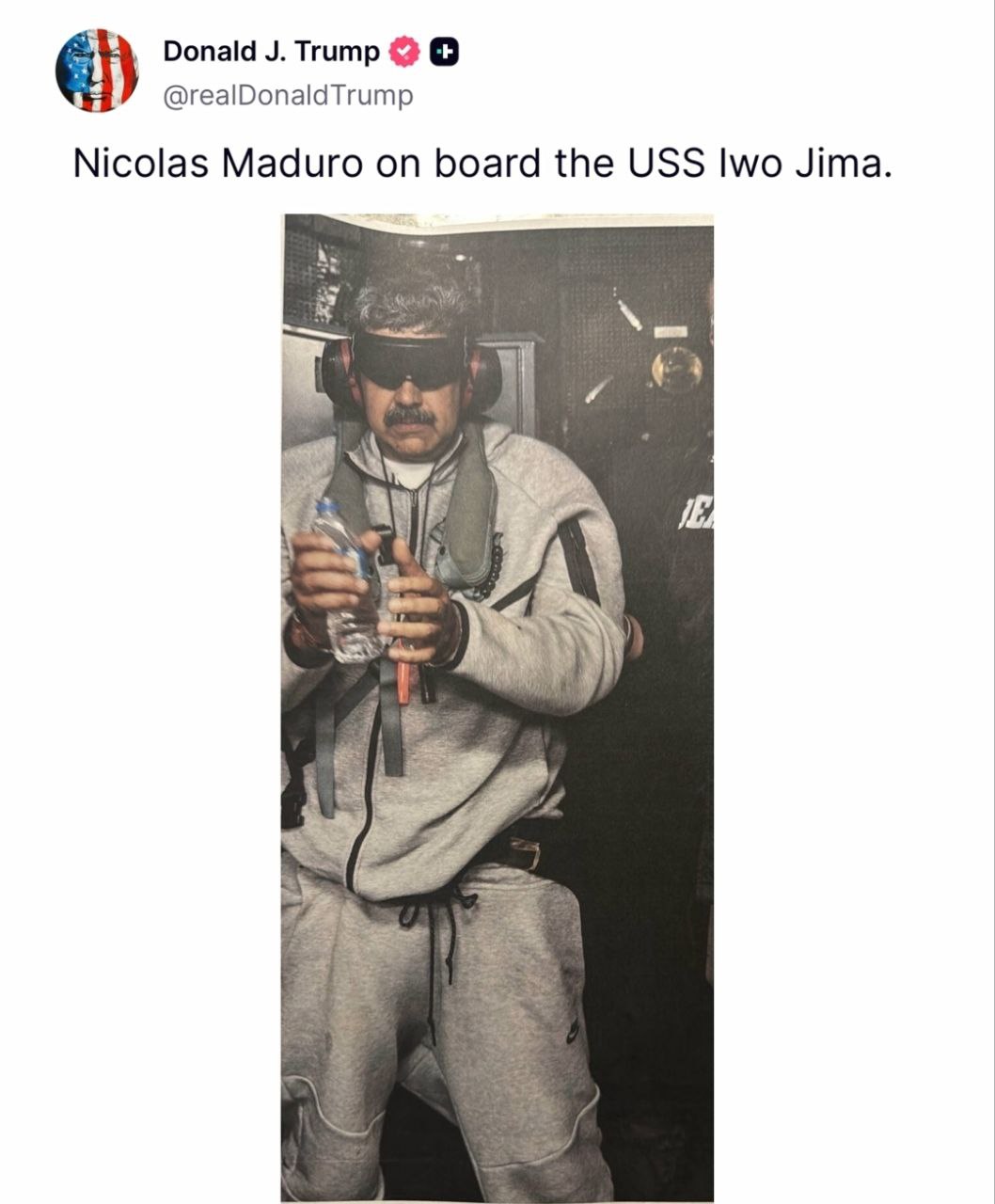 Ana səhifə / Dünya / Tramp Maduronun saxlanılması ilə bağlı foto paylaşıb Tramp Maduronun saxlanılması ilə bağlı foto paylaşıb 03.01.2026, 20:29 Operativ Media ABŞ Prezidenti Donald Tramp Venesuela lideri Nikolas Maduronun saxlanılması ilə bağlı foto paylaşıb.Operativ Media xəbər verir ki, Tramp sözügedən fotonu “Truth Social”da yayıb.Venesuela Prezidenti Nikolas Maduronun fotosu ABŞ Hərbi Dəniz Donanmasına aid “USS Iwo Jima” gəmisində lentə alınıb.