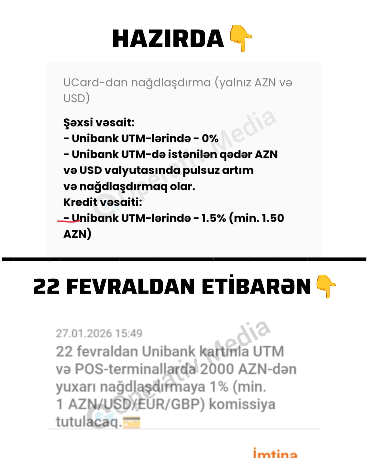 Ana səhifə / Slayder / "Unibank" kartlarından pulsuz nağdlaşdırmaya limit tətbiq ediləcək "Unibank" kartlarından pulsuz nağdlaşdırmaya limit tətbiq ediləcək 27.01.2026, 16:01 Operativ Media 22 fevraldan etibarən "Unibank"ın kartı ilə UTM və POS-terminallardan komissiyasız nağdlaşdırmaya görə limit tətbiq ediləcək.Operativ Media xəbər verir ki, 2000 AZN-dən yuxarı olan nağdlaşdırmaya görə 1 faiz (min. 1 AZN) komissiya tutulacaq.Qeyd edək ki, hazırda "Unibank" UTM-də istənilən qədər AZN və USD valyutasında pulsuz artım və nağdlaşdırma mümkündür.