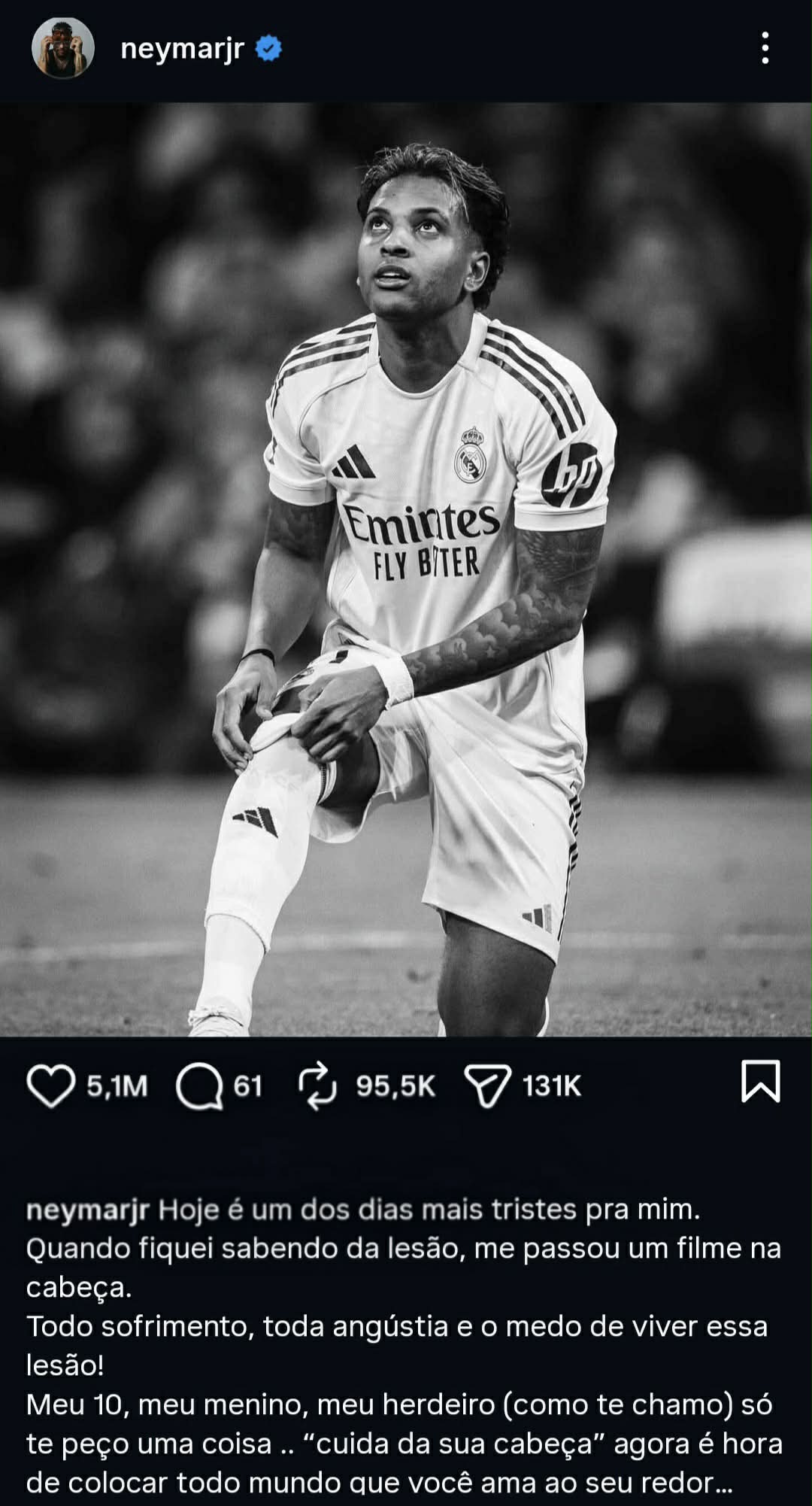 Braziliyalı ulduz futbolçu Neymar zədə alan həmyerlisi Rodriqoya sosial şəbəkə vasitəsilə emosional mesaj göndərib. O, Rodriqonun zədələndiyini eşidəndə çox kədərləndiyini bildirib.