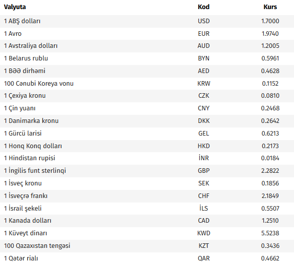 Ana səhifə / İqtisadiyyat / AMB-nin bu günə olan valyuta məzənnələri AMB-nin bu günə olan valyuta məzənnələri 10.03.2026, 09:13 Xəbərlər redaksiyası Azərbaycan Mərkəzi Bankının bu günə olan rəsmi valyuta məzənnələrinə əsasən, ABŞ dollarının məzənnəsi dəyişməyərək 1,7000 manat olub. Operativ Media xəbər verir ki, avronun məzənnəsi 0,005 % azalaraq 1,9740 manat, 100 Rusiya rublunun məzənnəsi 0,2 % artaraq 2,1677 manat təşkil edib.
