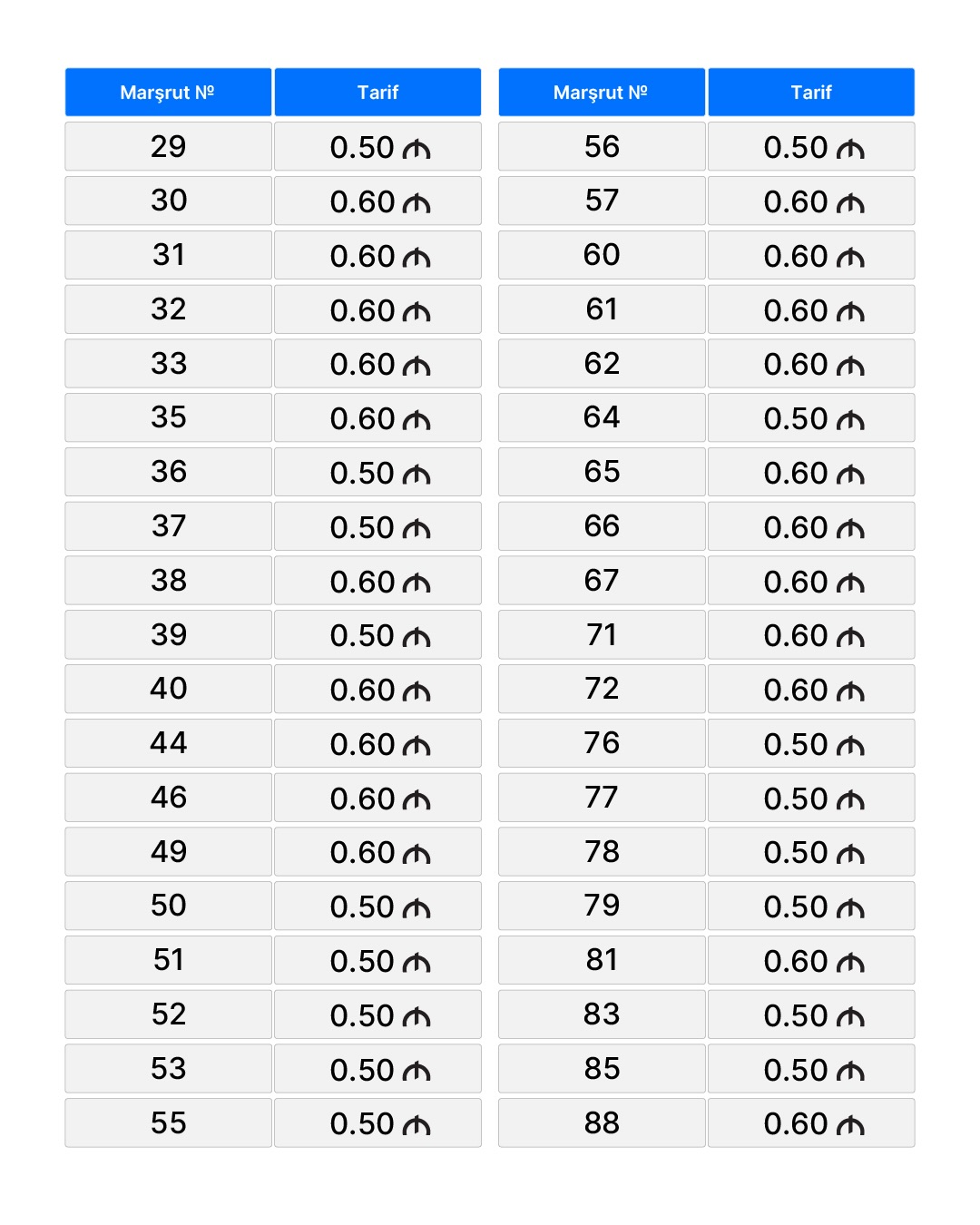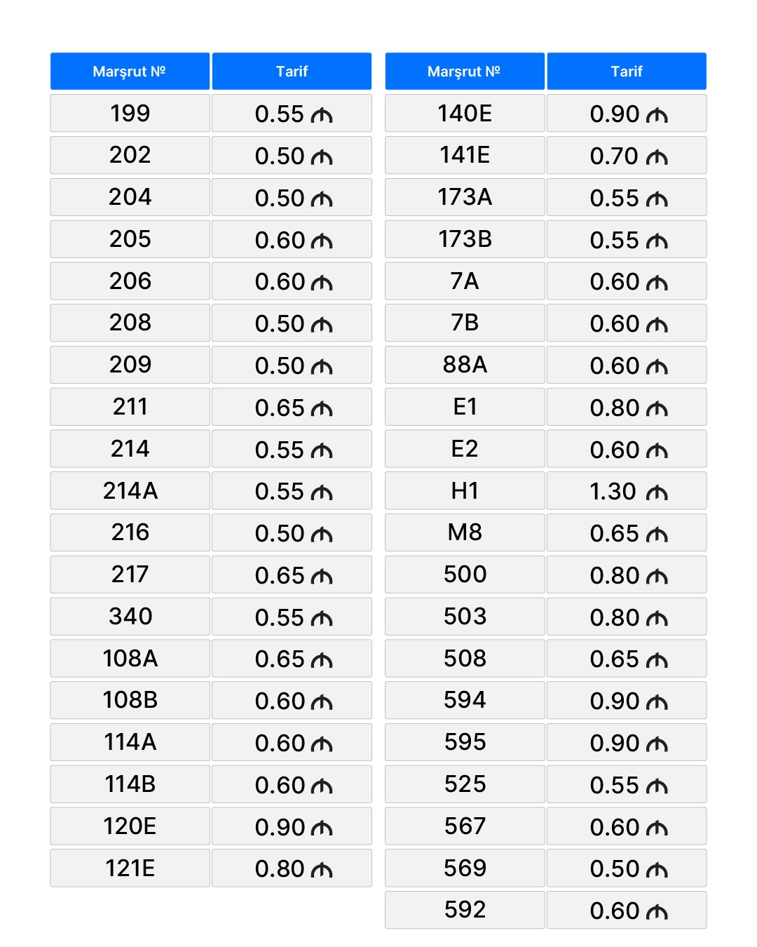 Ana səhifə / Slayder / Bakıda marşrut avtobuslarında gedişhaqqı MƏBLƏĞLƏRİ Bakıda marşrut avtobuslarında gedişhaqqı MƏBLƏĞLƏRİ 13.03.2026, 16:52 Operativ Media Bakı və paytaxtətrafı marşrut avtobuslarında nağdsız gedişhaqqı tarifləri yenilənib.Operativ Media xəbər verir ki, bu barədə AYNA məlumat yayıb.Belə ki, yenilənmiş marşrut avtobuslarında gedişhaqqı standart tariflərə uyğunlaşdırılıb.Buna əsasən, marşrut avtobuslarında nağdsız gedişhaqqı tarifləri aşağıdakı kimi müəyyən edilib: