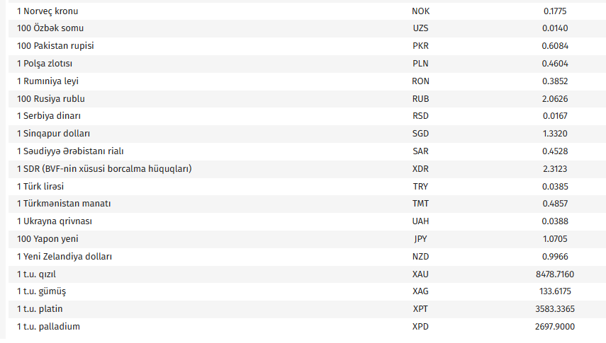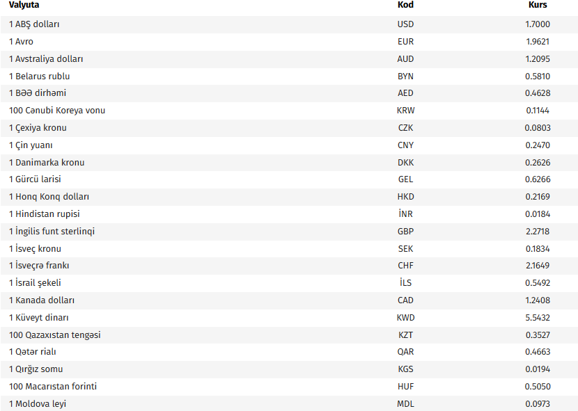 Ana səhifə / İqtisadiyyat / AMB-nin bu günə olan valyuta məzənnələri AMB-nin bu günə olan valyuta məzənnələri 18.03.2026, 09:13 Operativ Media Azərbaycan Mərkəzi Bankının bu günə olan rəsmi valyuta məzənnələrinə əsasən, ABŞ dollarının məzənnəsi dəyişməyərək 1,7000 manat olub. Operativ Media xəbər verir ki, avronun məzənnəsi 0,4 % artaraq 1,9621 manat, 100 Rusiya rublunun məzənnəsi 1,4 % azalaraq 2,0626 manat təşkil edib.
