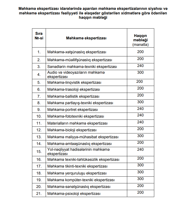 Məhkəmə ekspertizası idarələrində aparılan məhkəmə ekspertizalarının siyahısı və məhkəmə ekspertizası fəaliyyəti ilə əlaqədar göstərilən xidmətlərə görə ödənilən haqqın məbləği təsdiqlənib.