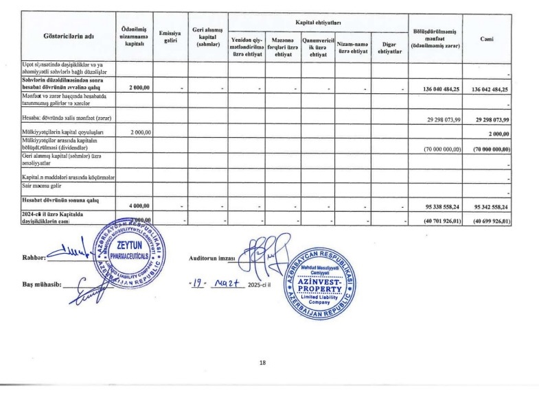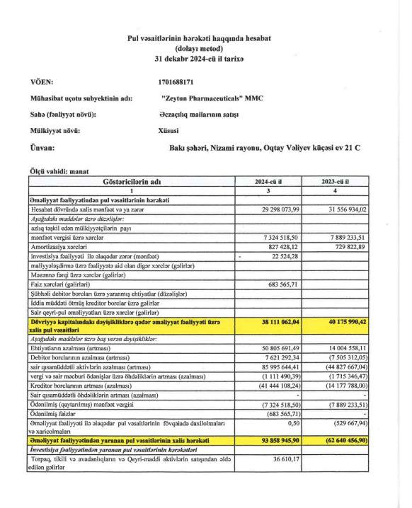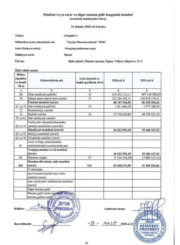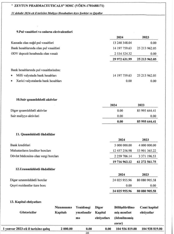 Ana səhifə / Ölkə / "Zeytun Pharmaceuticals" konsolidə edilmiş maliyyə hesabatını açıqladı "Zeytun Pharmaceuticals" konsolidə edilmiş maliyyə hesabatını açıqladı 31.03.2026, 18:20 Operativ Media "Zeytun Pharmaceuticals" MMC-nin 2024-cü il üzrə konsolidə edilmiş maliyyə hesabatı açıqlanıb. Operativ Media maliyyə hesabatını təqdim edir: