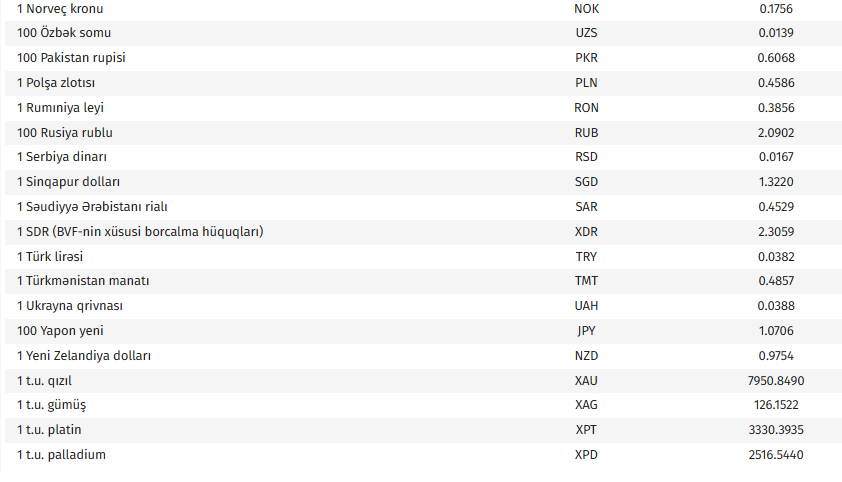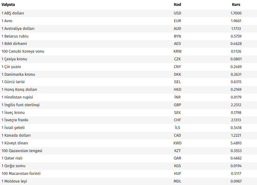 Ana səhifə / İqtisadiyyat / AMB-nin bu günə olan valyuta məzənnələri AMB-nin bu günə olan valyuta məzənnələri 01.04.2026, 09:09 Operativ Media Azərbaycan Mərkəzi Bankının bu günə olan rəsmi valyuta məzənnələrinə əsasən, ABŞ dollarının məzənnəsi dəyişməyərək 1,7000 manat olub. Operativ Media xəbər verir ki, avronun məzənnəsi 0,8 % artaraq 1,9661 manat, 100 Rusiya rublunun məzənnəsi 0,02 % artaraq 2,0902 manat təşkil edib.