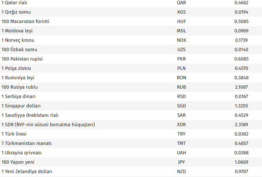 Ana səhifə / İqtisadiyyat / AMB-nin bu günə olan valyuta məzənnələri AMB-nin bu günə olan valyuta məzənnələri 02.04.2026, 09:13 Operativ Media Azərbaycan Mərkəzi Bankının bu günə olan rəsmi valyuta məzənnələrinə əsasən, ABŞ dollarının məzənnəsi dəyişməyərək 1,7000 manat olub. Operativ Media xəbər verir ki, avronun məzənnəsi 0,2 % azalaraq 1,9615 manat, 100 Rusiya rublunun məzənnəsi 0,9 % artaraq 2,1087 manat təşkil edib.