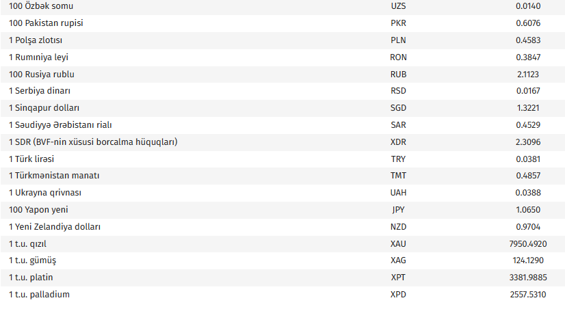 Ana səhifə / İqtisadiyyat / AMB-nin bu günə olan valyuta məzənnələri AMB-nin bu günə olan valyuta məzənnələri 03.04.2026, 09:15 Operativ Media Azərbaycan Mərkəzi Bankının bu günə olan rəsmi valyuta məzənnələrinə əsasən, ABŞ dollarının məzənnəsi dəyişməyərək 1,7000 manat olub. Operativ Media xəbər verir ki, avronun məzənnəsi 0,04 % azalaraq 1,9608 manat, 100 Rusiya rublunun məzənnəsi 0,2 % artaraq 2,1123 manat təşkil edib.