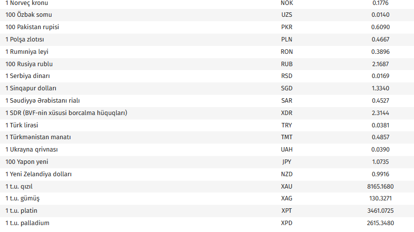 Ana səhifə / İqtisadiyyat / AMB-nin bu günə olan valyuta məzənnələri AMB-nin bu günə olan valyuta məzənnələri 08.04.2026, 09:10 Operativ Media Azərbaycan Mərkəzi Bankının bu günə olan rəsmi valyuta məzənnələrinə əsasən, ABŞ dollarının məzənnəsi dəyişməyərək 1,7000 manat olub. Operativ Media xəbər verir ki, avronun məzənnəsi 1,2 % artaraq 1,9850 manat, 100 Rusiya rublunun məzənnəsi 0,8 % artaraq 2,1687 manat təşkil edib.