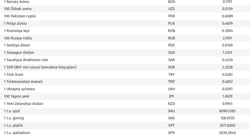 Ana səhifə / İqtisadiyyat / AMB-nin bu günə olan valyuta məzənnələri AMB-nin bu günə olan valyuta məzənnələri 10.04.2026, 09:20 Operativ Media Azərbaycan Mərkəzi Bankının bu günə olan rəsmi valyuta məzənnələrinə əsasən, ABŞ dollarının məzənnəsi dəyişməyərək 1,7000 manat olub. Operativ Media xəbər verir ki, avronun məzənnəsi 0,2 % artaraq 1,9877 manat, 100 Rusiya rublunun məzənnəsi 1 % artaraq 2,1931 manat təşkil edib.