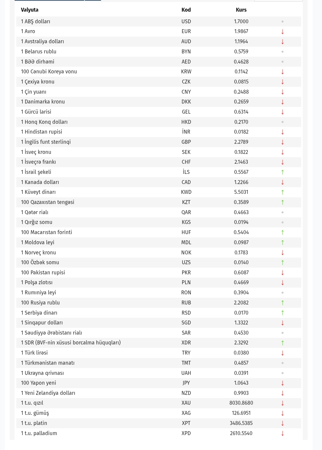 Ana səhifə / İqtisadiyyat / AMB-nin bu günə olan valyuta məzənnələri AMB-nin bu günə olan valyuta məzənnələri 13.04.2026, 09:51 Operativ Media Azərbaycan Mərkəzi Bankı bu günün valyuta məzənnələrini açıqlayıb. Operativ Media xəbər verir ki, aprelin 13-də ABŞ dollarının məzənnəsi dəyişməyərək 1,7000 manat təşkil edib. Avronun məzənnəsi isə ucuzlaşaraq 1.9867 manat təşkil edib.