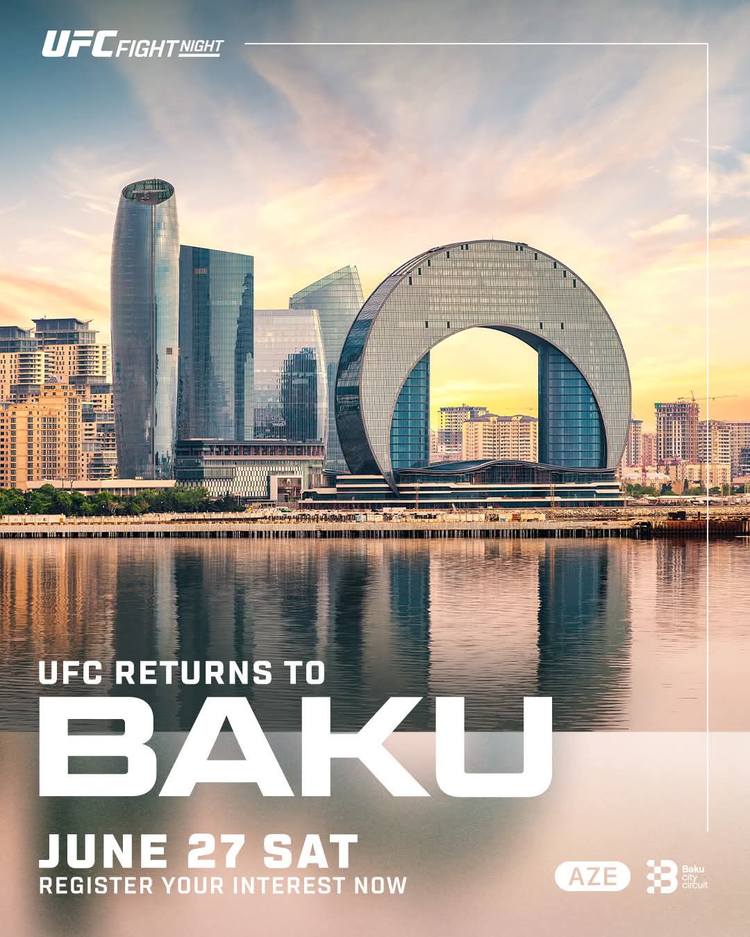 Ana səhifə / İdman / UFC təşkilatı Bakıda növbəti döyüş gecəsi təşkil edəcək - RƏSMİ UFC təşkilatı Bakıda növbəti döyüş gecəsi təşkil edəcək - RƏSMİ 21.04.2026, 15:24 Operativ Media UFC təşkilatı Bakıda növbəti dəfə döyüş gecəsi təşkil edəcək.Operativ Media xəbər verir ki, bu haqda təşkilatın sosial media hesabında paylaşım edilib.Paylaşımda döyüş gecəsinin iyunun 27-də Bakıda keçiriləcəyi qeyd edilib.