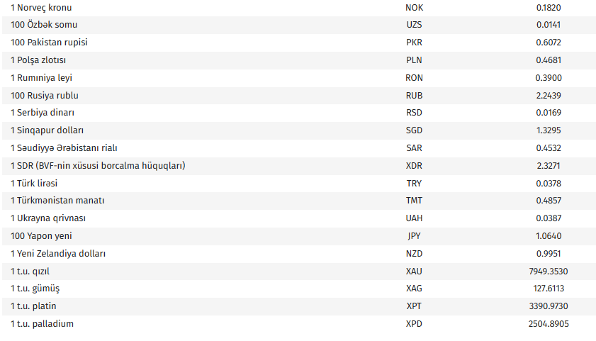Ana səhifə / İqtisadiyyat / AMB-nin bu günə olan valyuta məzənnələri AMB-nin bu günə olan valyuta məzənnələri 24.04.2026, 09:13 Operativ Media Azərbaycan Mərkəzi Bankının bu günə olan rəsmi valyuta məzənnələrinə əsasən, ABŞ dollarının məzənnəsi dəyişməyərək 1,7000 manat olub. Operativ Media xəbər verir ki, avronun 0,2 % azalaraq 1,9855 manat, 100 Rusiya rublunun məzənnəsi 0,9 % azalaraq 2,2439 manat təşkil edib.