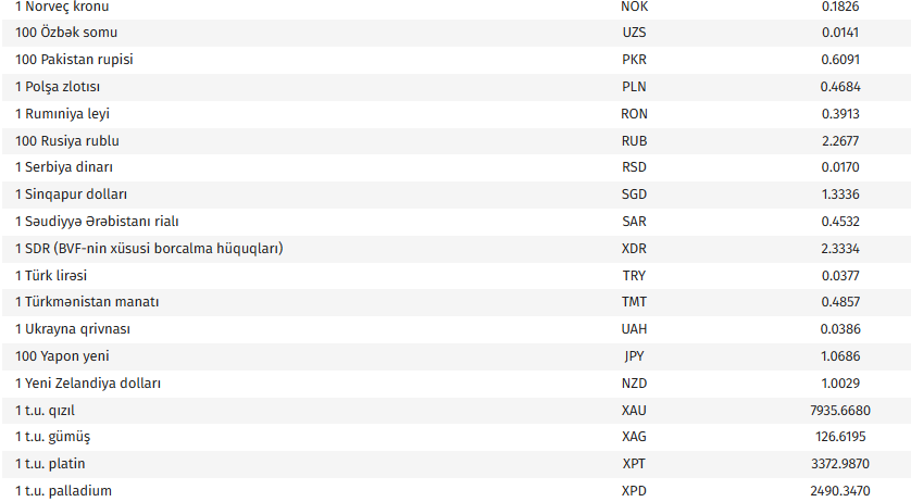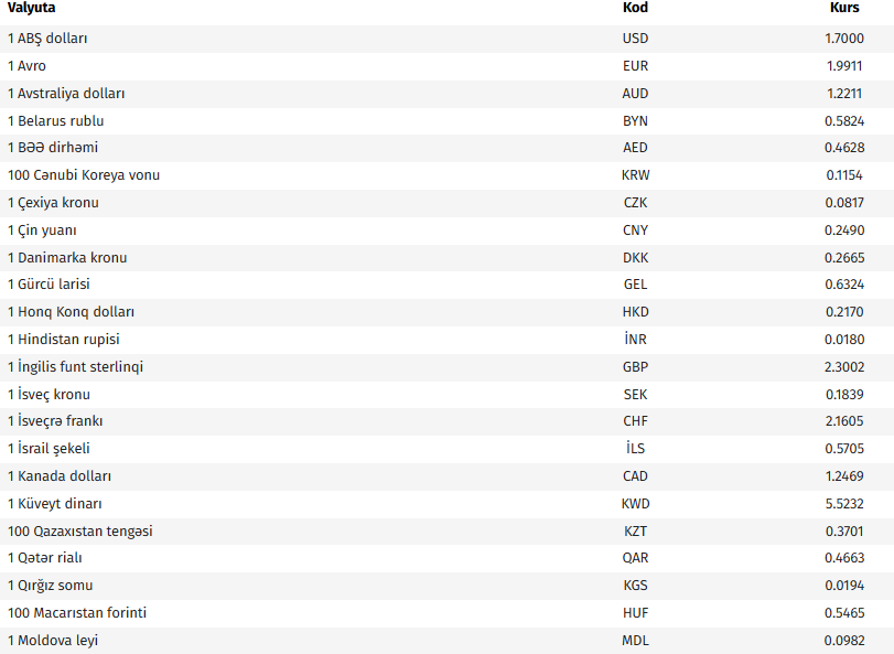 Ana səhifə / İqtisadiyyat / AMB-nin bu günə olan valyuta məzənnələri AMB-nin bu günə olan valyuta məzənnələri 28.04.2026, 09:12 Operativ Media Azərbaycan Mərkəzi Bankının bu günə olan rəsmi valyuta məzənnələrinə əsasən, ABŞ dollarının məzənnəsi dəyişməyərək 1,7000 manat olub. Operativ Media xəbər verir ki, avronun 0,12 % azalaraq 1,9911 manat, 100 Rusiya rublunun məzənnəsi 0,45 % artaraq 2,2677 manat təşkil edib.
